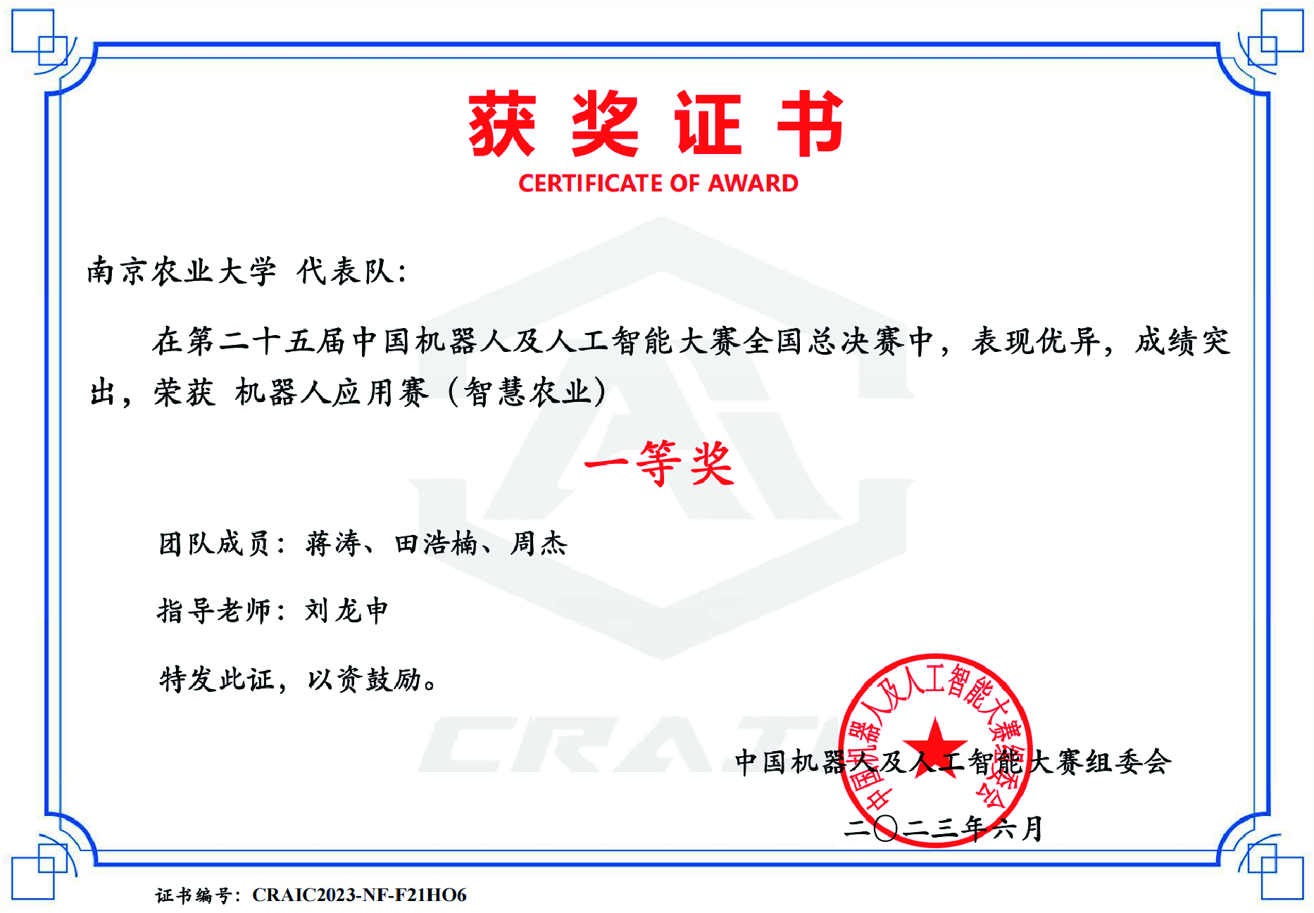 第二十五届中国机器人及人工智能大赛全国总决赛一等奖
